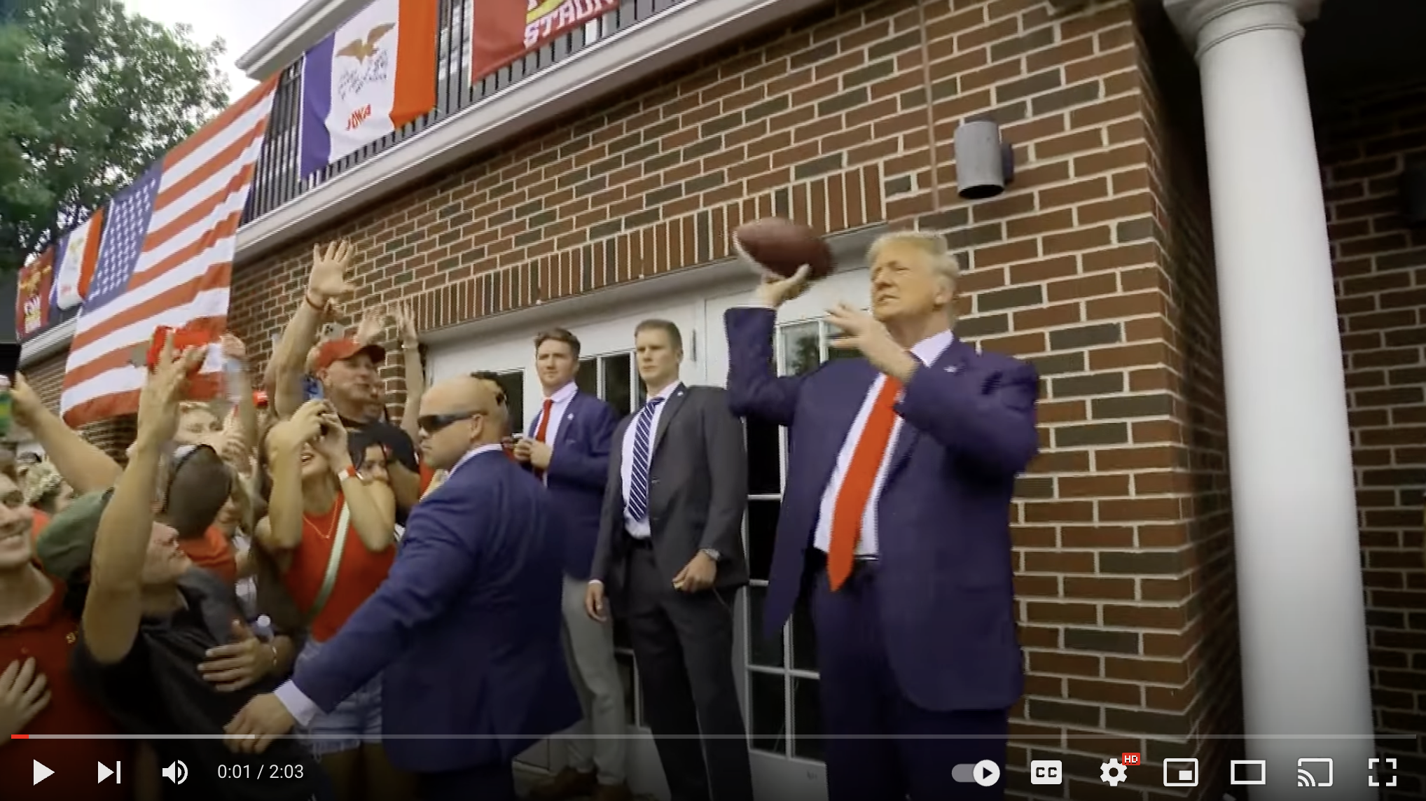 Prior to the game, Trump enjoyed quality time with hundreds of members of Iowa State University fraternity house Alpha Gamma Rho, throwing autographed footballs into the crowd.